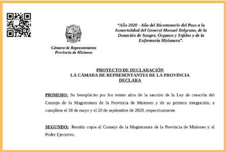 Declara el beneplácito por los veinte años de la sanción de la Ley de Creación del Consejo de la Magistratura de la Provincia de Misiones, y de su primera integración, a conmemorarse el 18 de mayo y el 20 de septiembre de 2020.
